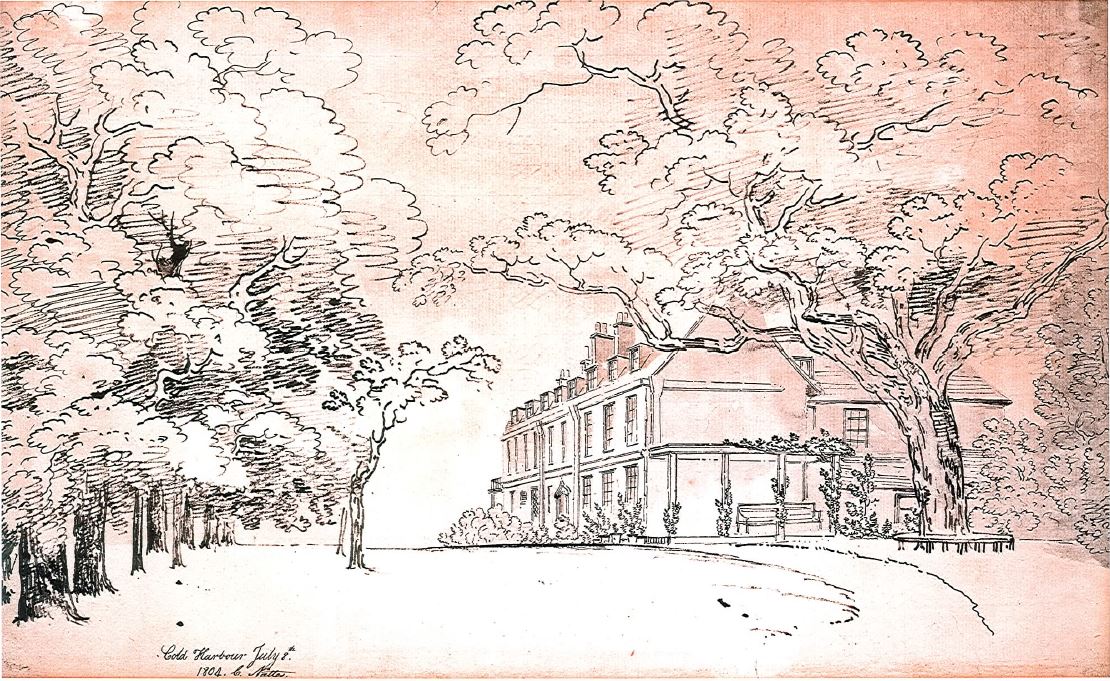 This drawing of Cold Harbour, a large late Georgian house built near to the original Coldharbour Farm, east of Loughborough Junction. Dated 8th July 1804 it is an ink drawing by John Claude Nattes and is part of the Lambeth Landmark History Collection held at Minet Road Library.