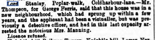 There was, though a hiccup in getting his license for the Lord Stanley as he was refused as this report in the Morning Advertiser 01 April 1869.