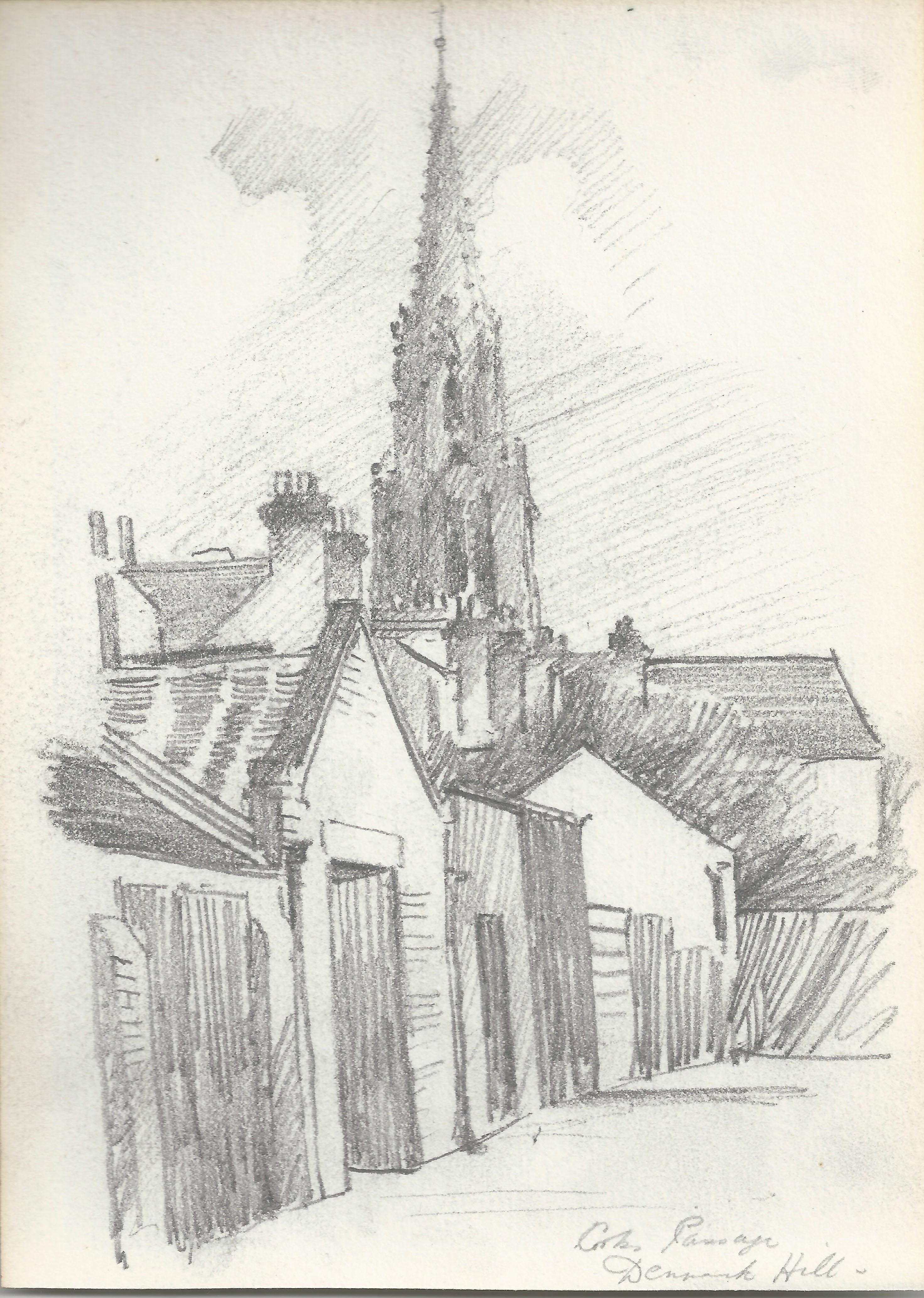 A pencil drawing by Ernest Sutton from 1907 showing the Garages with St Matthews Church on Denmark Hill in the background.