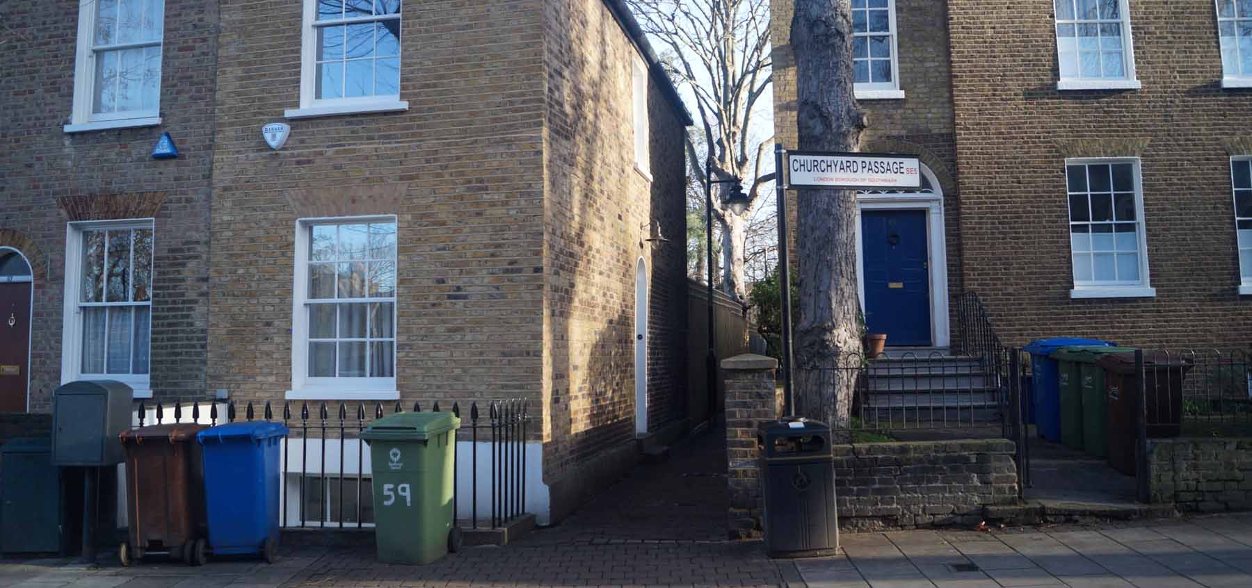 A postcard showing Church Passage, Camberwell by Albert Flint, postally